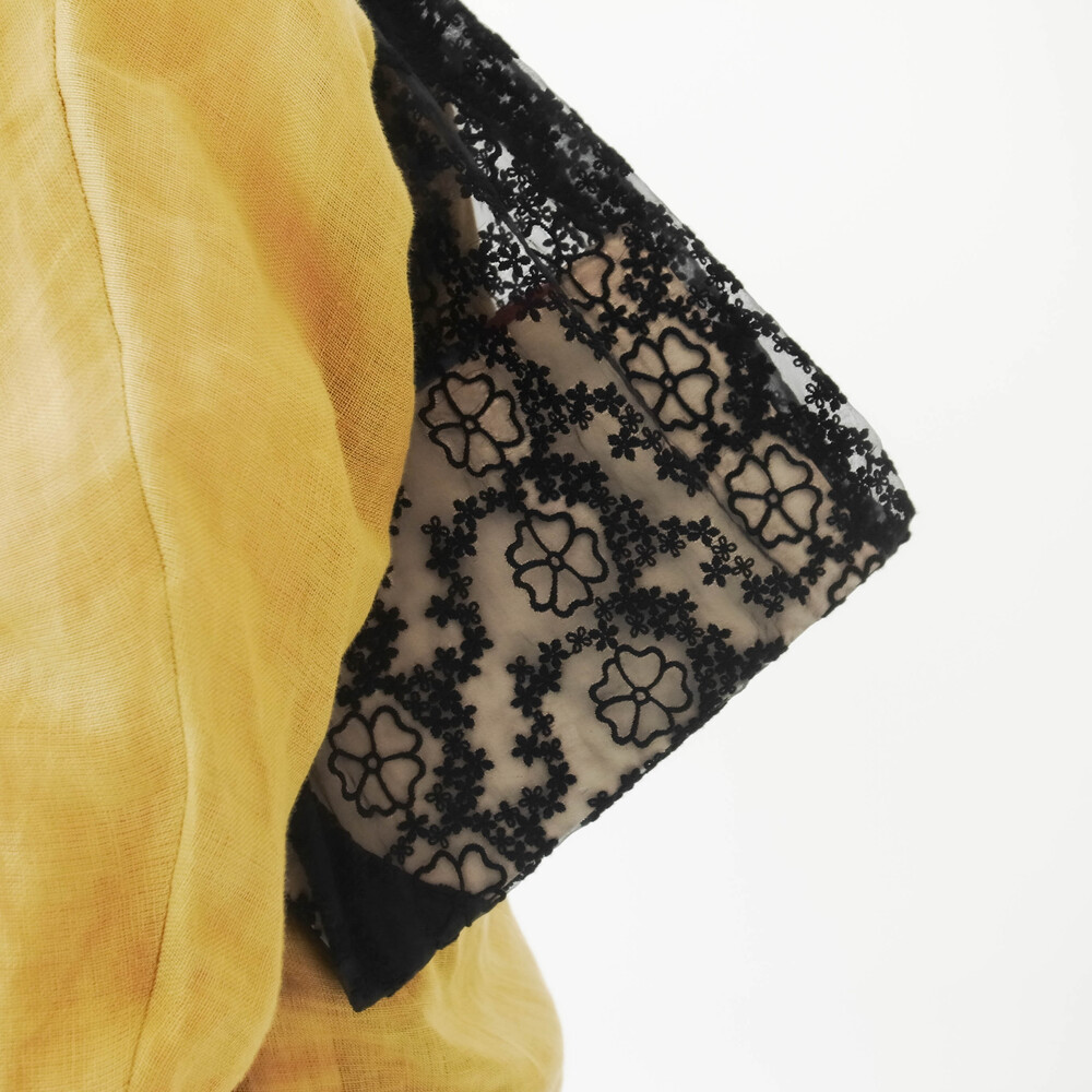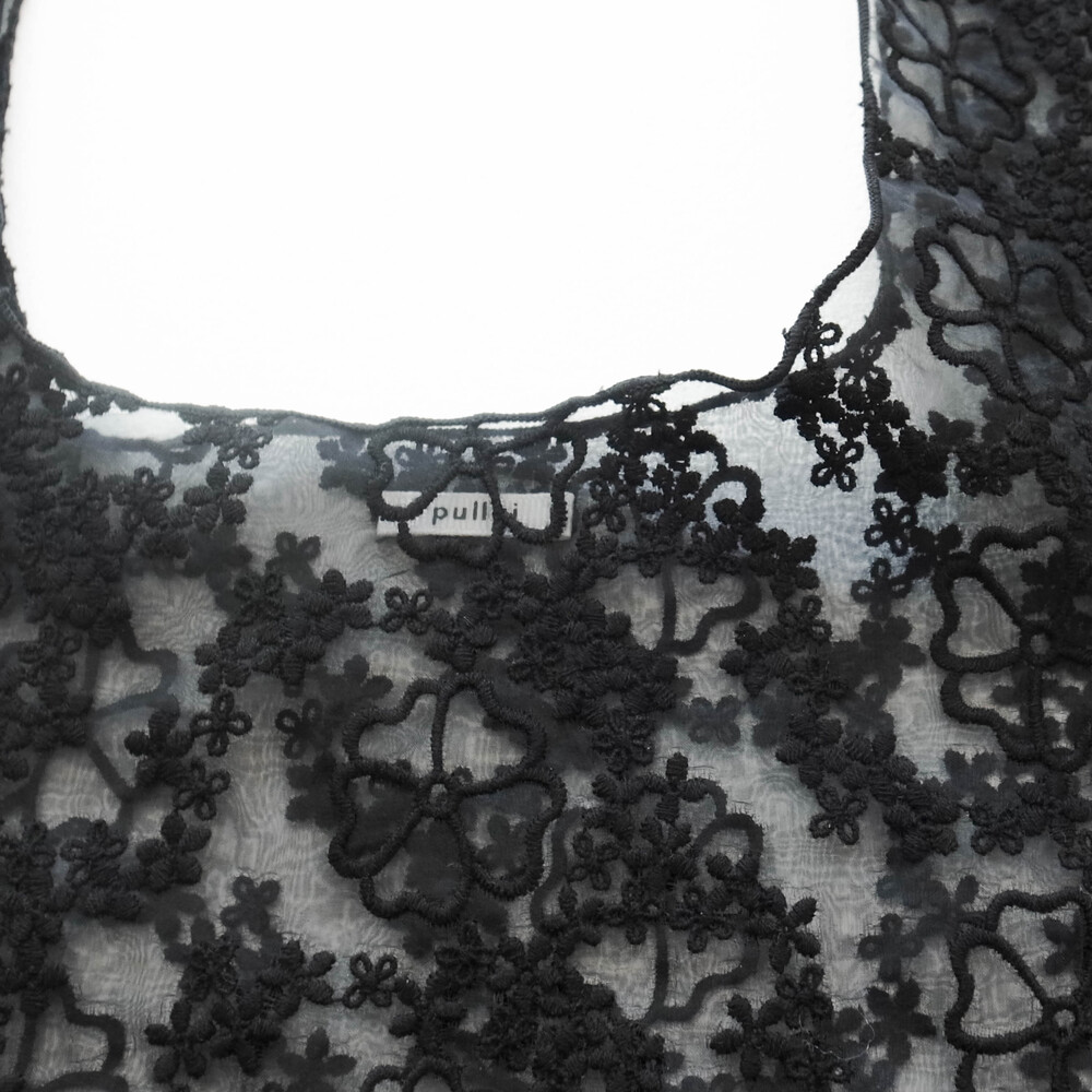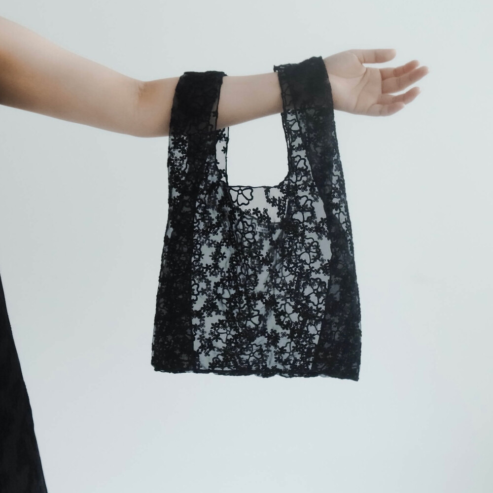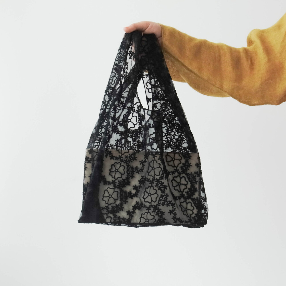 희소성 높은 블랙 레이스 원단 다섯잎클로버 자수패턴 핸디형으로 단독 및 서브백으로 쉽게 매치가능 토트백으로 연출 가능한 리본끈 추가증정